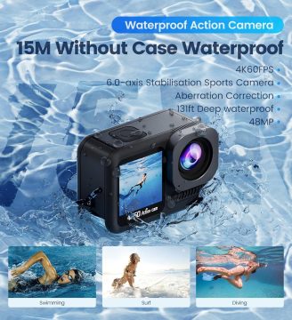 • 4K60FPS Waterproof Action Camera,48MP 15M Bare Underwater Camera with 64GB Card,8X Zoom Touch Screen SportsCamera,6-axis EIS Motorcycle Camera with Remote Control Distortion Correction
