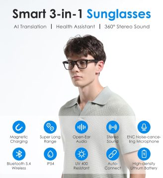 • Bluetooth Smart Glasses for Men & Women, Anti-Blue Light, AI Translator Powered by ChatGPT, 11H Life, Voice Control, Audio Smart Eyewear for Gaming Travel Meeting Memos